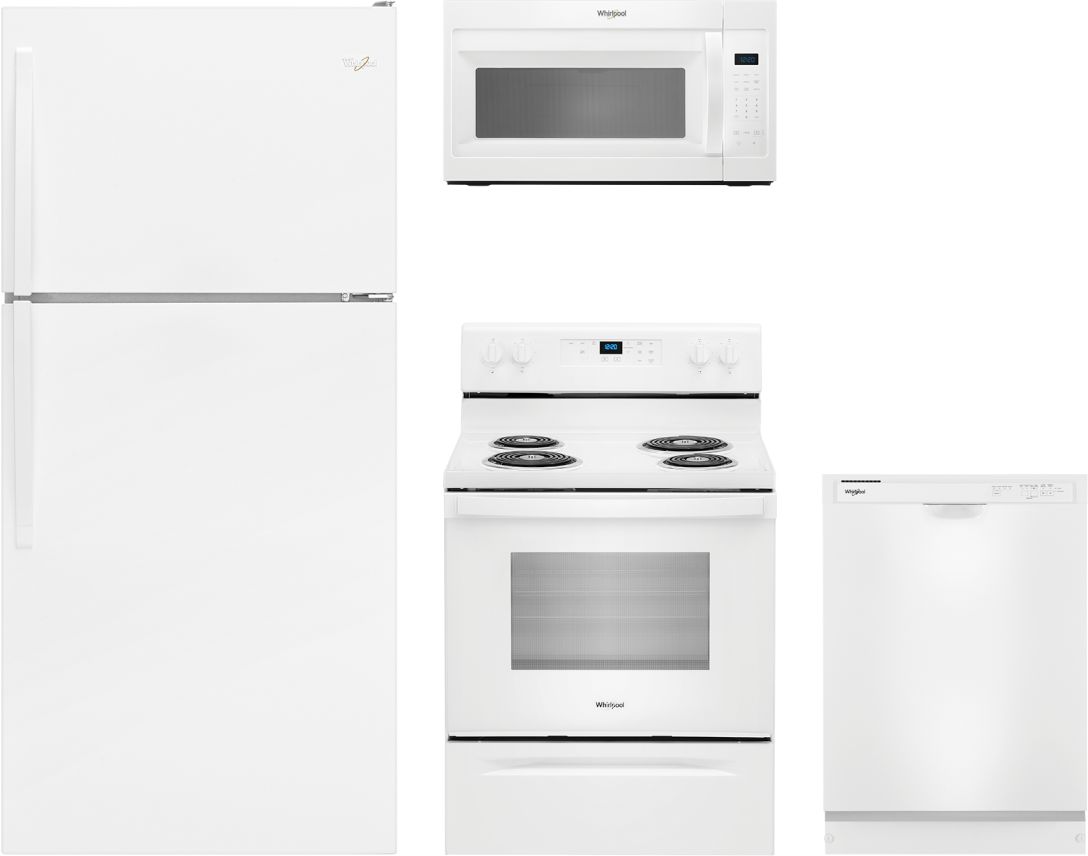 Whirlpool® 4 Piece White Kitchen Package with top freezer refrigerator, freestanding electric range, built in dishwasher and over the range microwave.Read More